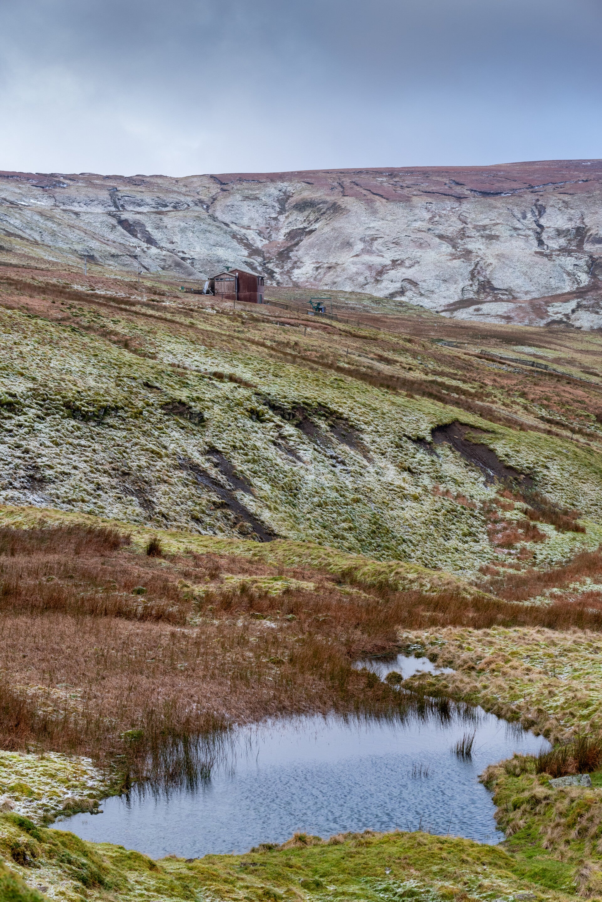 I set off really early to reach Swinhope Moor in Weardale at sunrise. My intention was to catch a good photo of the snaking river that I saw from the road the day before. When I arrived I noticed that it was impossible to catch the "snaking" because the standpoint would be too low. So I continued along the road and stopped higher up where I took the photos of the deer the day before. Only than I noticed there was a proper ski lift. I decided to walk towards the ski hut and take lots of shots on the way up. Since the "snake" was already far away and it was definitely no weather to carry a lot of kit with you I only took the D750 with the 70 - 300 lens (the right decision for once :) ) The walk was really exhausting trying to gain higher ground all the time, trying out the perspective and realising that I had to climb even higher to get a good composition. I continued despite the rough weather conditions (temperature -3 below celsius and gusty wind) and finally reached the ski hut at the top. It was great because as you can see on photo no2 every now and than the clouds broke and gave