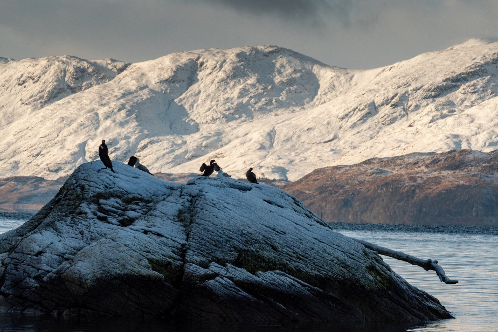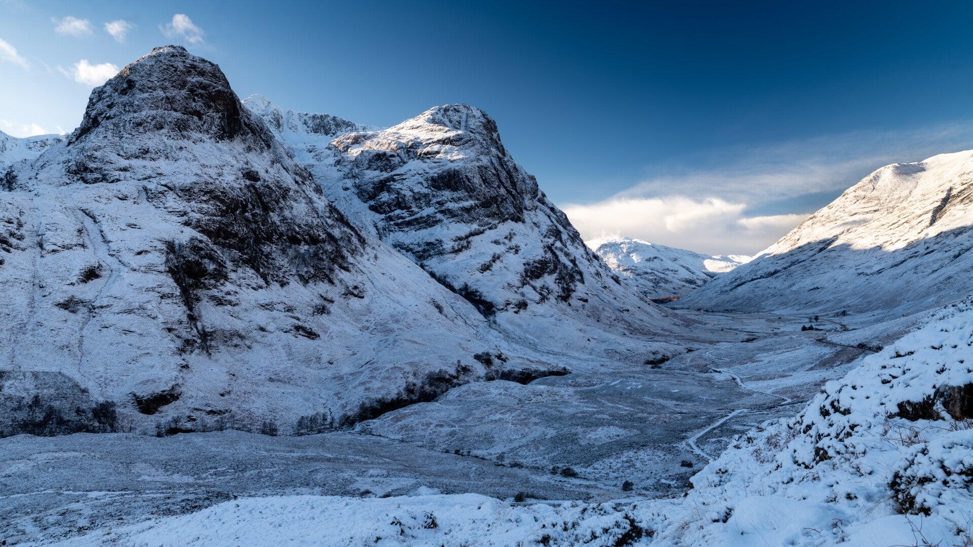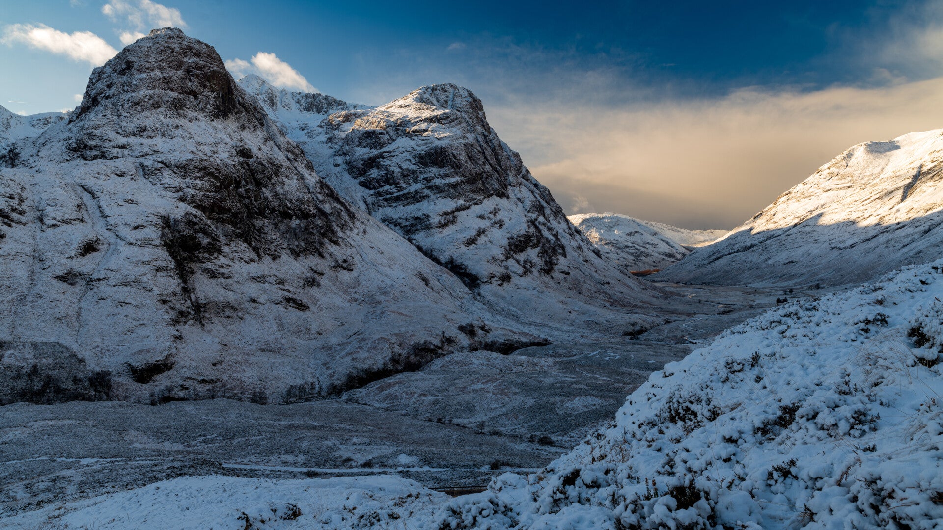 I found the parking spot for the vantage point and the good stepped path up. The snowy conditions were not too tricky to climb up. From this vantage point high above the main road you have a splendid view towards Glencoe with the three sisters on the left and the ridge of Aonach Eagach on the right. I arranged for some good shots from the tripod and than took some more detail shots with the zoom lens without the tripod since the light was good enough. But than I noticed a weather front coming up from Glencoe (visible already on the last photo) and I quickly made my way down again just in time to reach the car when a fierce snow storm started....