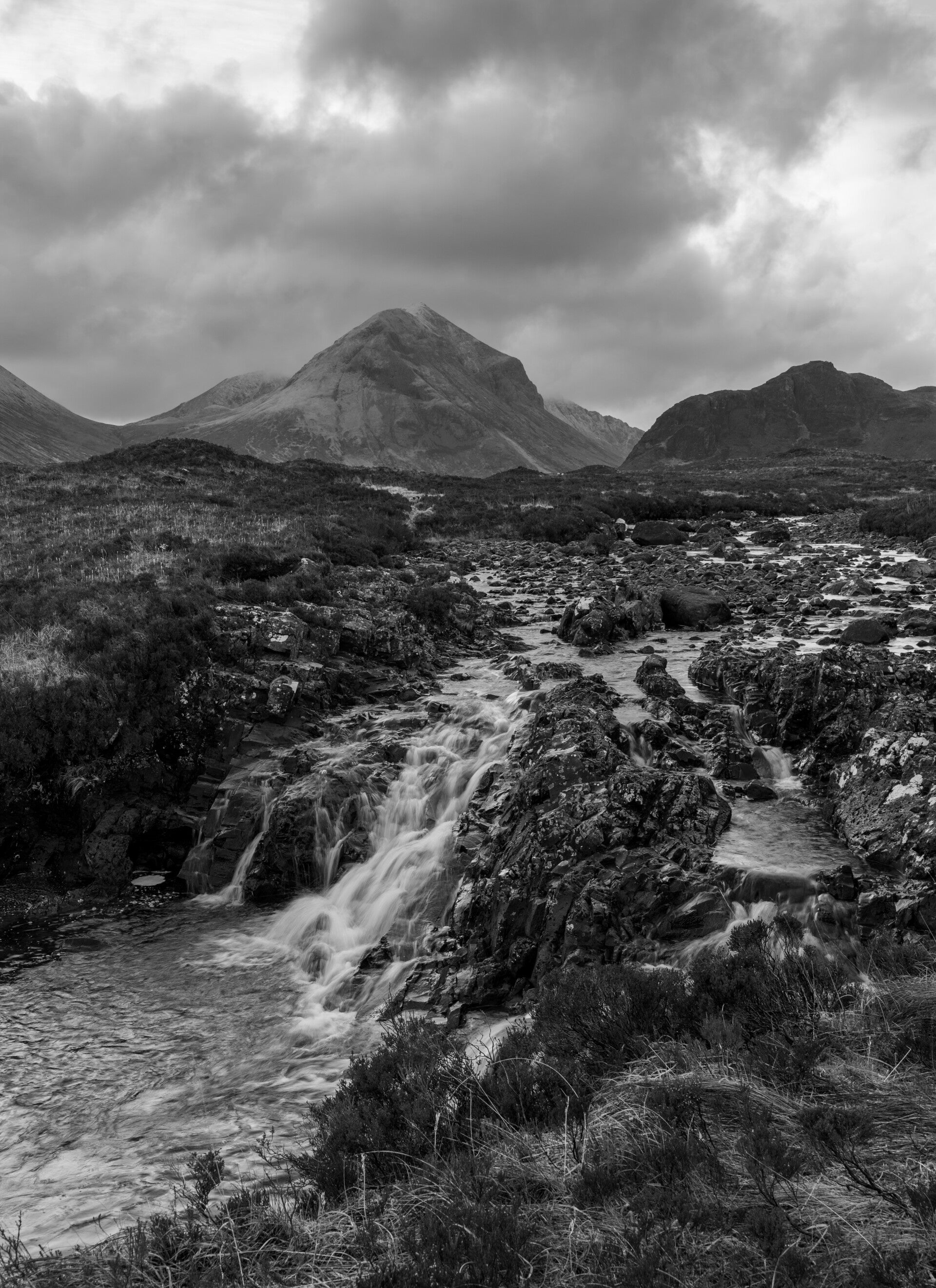 Glen Sligachan is a long valley that divides the Black Cuillin from the Red Cuillin. The Sligachan Hotel is at the foot of the Glen right next to the old Bridge. On the first dawn shoot we walked up towards Allt Dearg Cottage to a waterfall which has the peaks of Sgurr Nan Gillean as background. It was necessary to stand right at the edge of the rocky pool to be able to catch the whole waterfall. It than was difficult to catch the mountains plus the sky above in landscape orientation. I was regretting not to have taken my 10mm lens with me....