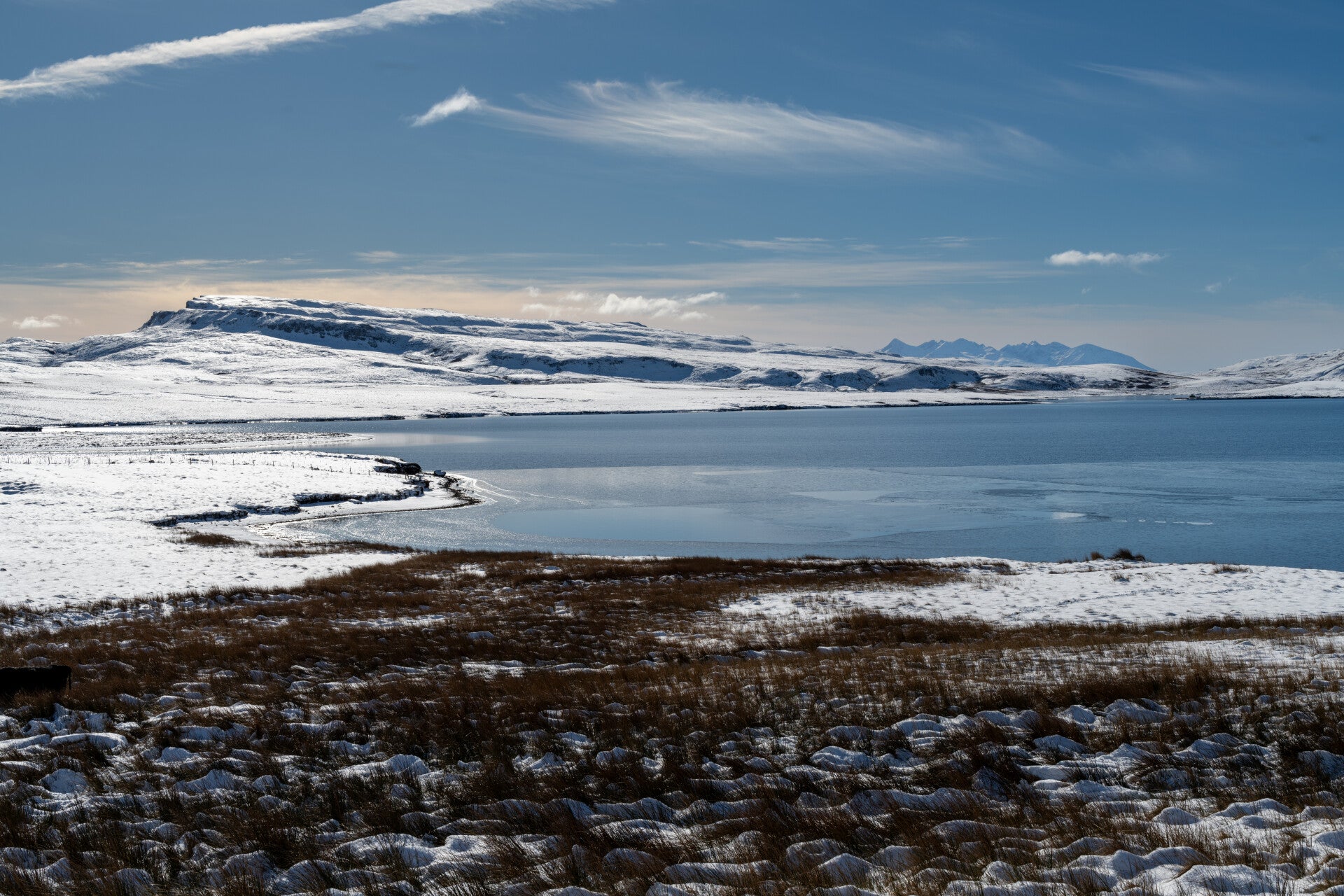 The Quiraing (pronounced kwir-ang) is at the northern end of the Trotternish Ridge. After Portree the road takes you along Loch Fada and the Old man Of Storr. We stopped twice along the way and were able to take some great shots back across Loch Leathan (the next Loch after Loch Fada) with the Cuillins in the distance and further along beside the steep cliffs with great views across the bay towards the Isle of Rona and the mountain ranges on the mainland. With the Quiraing in view we stopped and checked if cars were going up the steep pass. On the last two photos you can see the plateau where we later were and you can just make out the thin line which is the steep road leading up to the Quiraing. There was no traffic so we expected the pass to be closed which meant we had to walk up the Quiraing......