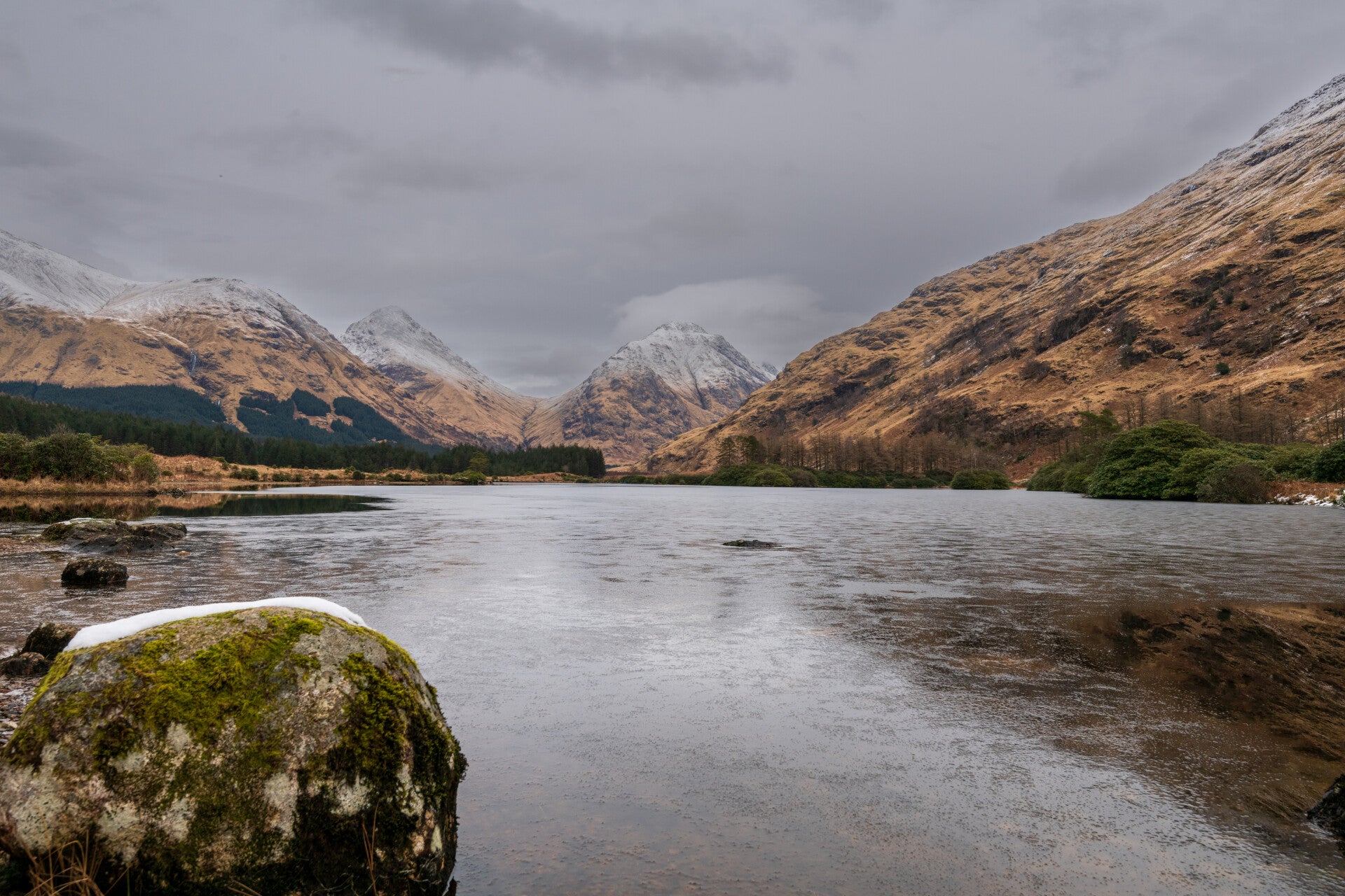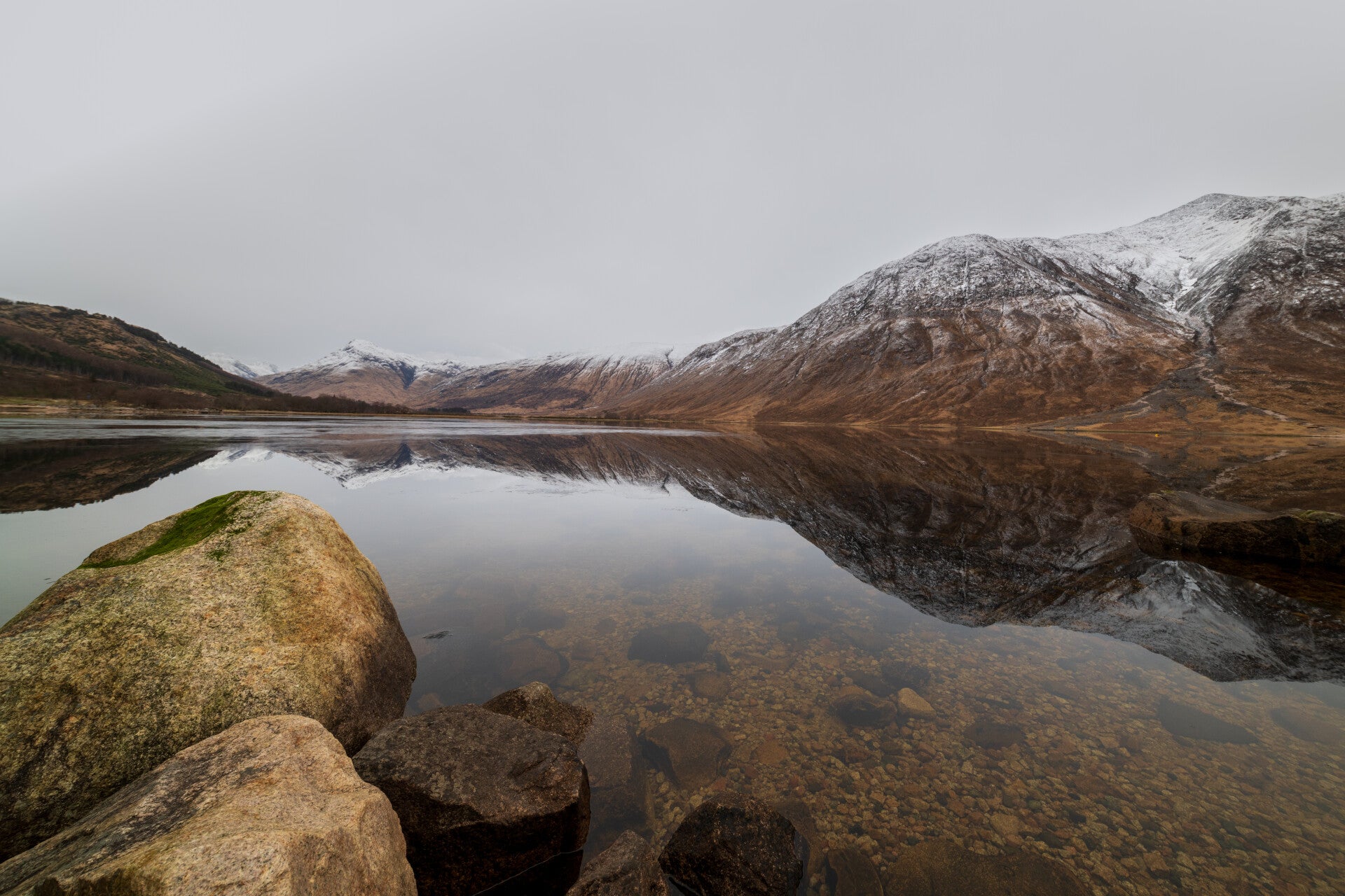 I also took some great shots of that waterfall in January 2024. When you follow the single track road further you come to a waterfall which is called Triple Falls and is at the beginning of a rocky gorge (next 2 shots (photo 9 and 10)). Access to the gorge was far too dangerous for us due to the weather conditions so we continued along the single track road until we arrived at Lochan Urr which is around midway through Glen Etive. We walked down to the Loch and had a great time enjoying the wonderful scenery (shots 11 - 18). Although already tired we drove the rest of the track until we arrived at Loch Etive where we walked around and found some fantastic spots to get the reflexions and the moody sky which made the sun look almost moonlike. I again made use of the 10mm lens (last 6 shots). The way back on the same single track was strenuous but it was a great trip.