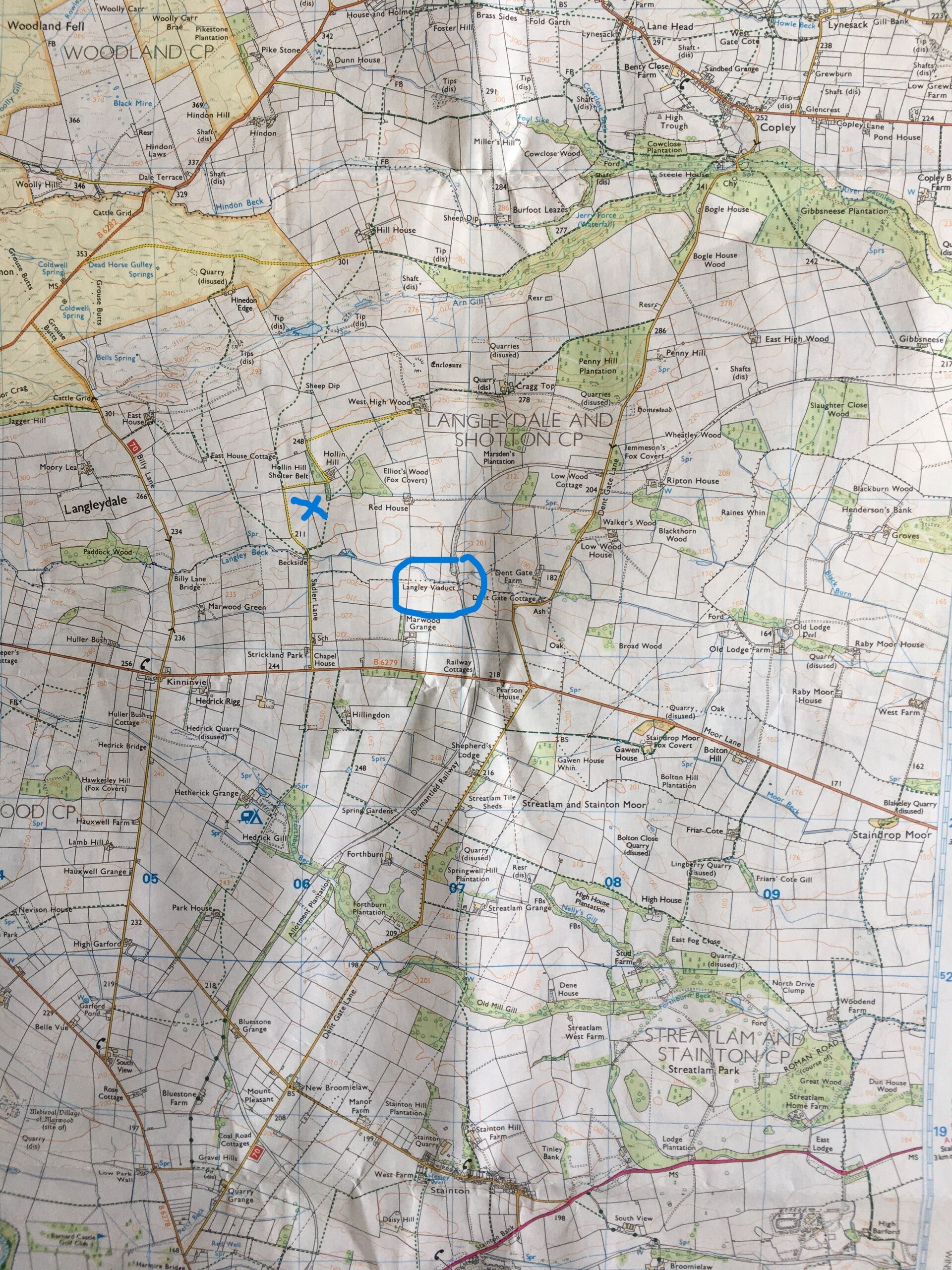 Whenever I came back to Curlew Cottage from Eggleston I noticed a viaduct in the distance. I checked the map and found out that it is Langley Viaduct. One sunny afternoon I made the short trip from the cottage. It was however confirmed what was already clear from looking at the map. There is no access to the viaduct. So I took the photos from the spot marked with an X on the map.