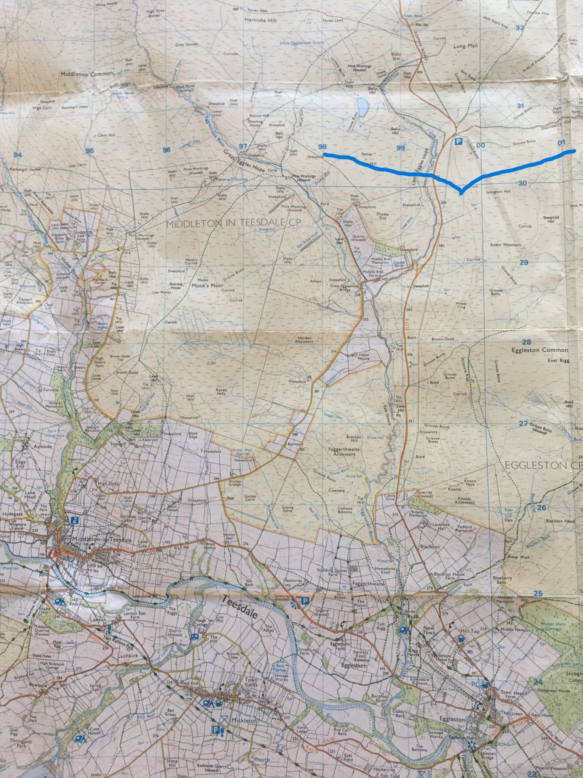 The second panorama "8570" is taken from the height on the other side looking north towards Stanhope (map no 2). When you zoom in on the second panorama Stanhope is hidden down below but you can see in the distance the very steep road "Crawley side" that goes up and finally brings you into Blanchland (in the heather part roughly in the middle between the two green patches). The one but last picture shows a detail of the second panorama with the two small picturesque tarns further down. The last photo on this page is taken later on the decent towards Egglestone with the view across Teesdale, you can see Grassholme Reservoir and Kirkcarrion (at the right of the picture) in the shadow of a cloud.
